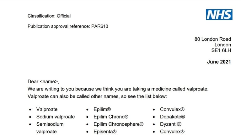 LETTER SENT TO WOMEN & GIRLS PRESCRIBED VALPROATE 2021